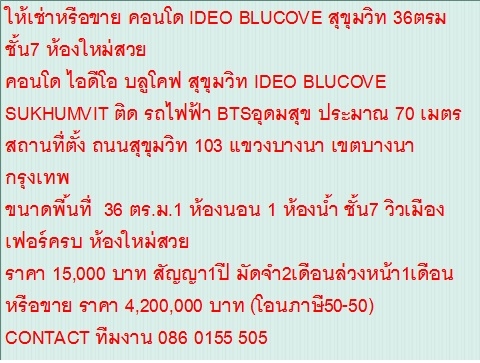 ให้เช่าหรือขายคอนโด Ideo bluecove 36ตรม ติดBTSอุดมสุข ถนนสุขุมวิท