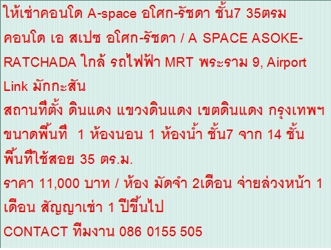 ไม่รับนายหน้า ให้เช่าคอนโด A-space อโศก-รัชดา ชั้น7 35ตรม