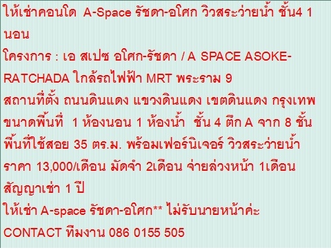 ไม่รับนายหน้า ให้เช่าคอนโด A-Space รัชดา-อโศก วิวสระว่ายน้ำ ชั้น4 1นอน