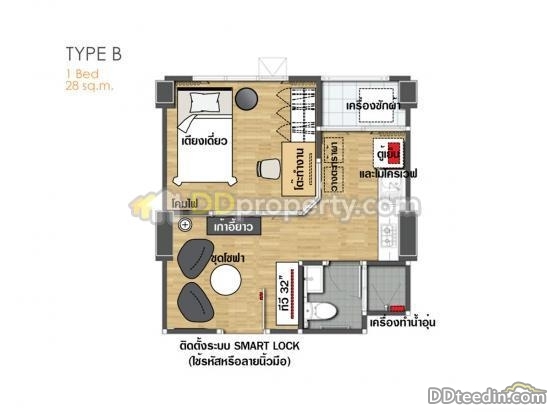 พื้นที่ใช้สอย 28 ตารางเมตร 1 ห้องนอน 1 ห้องน้ำ ชั้น 20