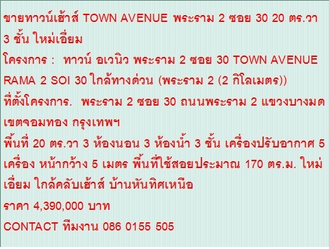 ขายทาวน์เฮ้าส์ TOWN AVENUE พระราม 2 ซอย 30 20 ตร.วา 3 ชั้น ใหม่เอี่ยม