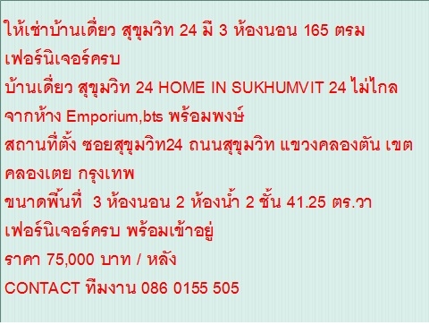 ไม่รับนายหน้า ให้เช่าบ้าน SUKHUMVIT 24 มี 3 ห้องนอน 165 ตรม เฟอร์นิเจอร์ครบ / ให้เช่าบ้าน SUKHUMVIT 24 มี 3 ห้องนอน 165 ตรม เฟอร รายละเอียด ให้เช่าบ้านเดี่ยว สุขุมวิท 24 มี 3 ห้องนอน 165 ตรม เฟอร์นิเจอร์ครบ