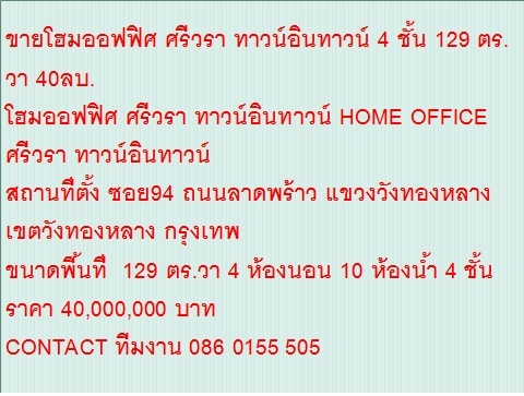 ขายโฮมออฟฟิศ ศรีวรา ทาวน์อินทาวน์ 4 ชั้น 129 ตร.วา 40ลบ.