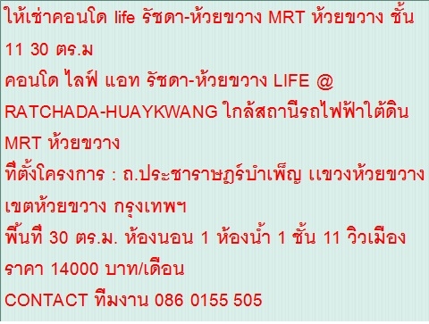 ให้เช่าคอนโด life รัชดาห้วยขวาง ชั้น 11 ห้อง 30 ตร.ม.