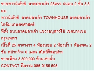 ขายทาวน์เฮ้าส์ ลาดปลาเค้า 25ตรว 4นอน 2 ชั้น 3.3ลบ.