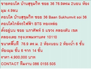 ขายคอนโดสุขุมวิท 36 อยู่ใกล้รถไฟฟ้าBTS ทองหล่อ 2 ห้องนอน 76.90 ตร.ม.ราคา 4.9 ล้าน ห้องมุม