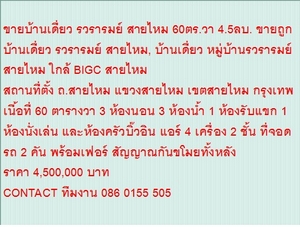 ขายบ้านเดี่ยว รวรารมย์ สายไหม 60ตร.วา 4.5ลบ. ขายถูก