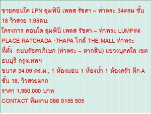 ขายคอนโด LPN ลุมพินี เพลส รัชดา – ท่าพระ 34ตรม ชั้น18 วิวสวย 1.95ลบ.