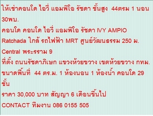 ไม่รับนายหน้า ให้เช่าคอนโด ไอวี่ แอมพิโอ รัชดา ชั้นสูง 44ตรม 1 นอน 30พบ.