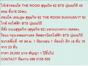 | สภาพ: | เดอะรูม สุขุมวิท 62 | จังหวัด: | กรุงเทพมหานคร | ||