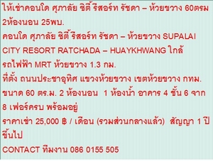 ไม่รับนายหน้า ให้เช่าคอนโด ศุภาลัย ซิตี้ รีสอร์ท รัชดา – ห้วยขวาง 60ตรม 2ห้องนอน 25พบ.