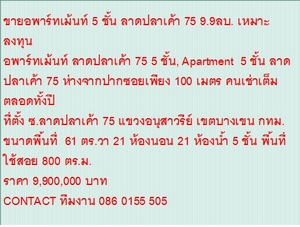 ขายอพาร์ทเม้นท์ 5 ชั้น ลาดปลาเค้า 75 9.9ลบ. เหมาะลงทุน