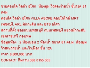 ไม่รับนายหน้าทุกรณี ขายคอนโด วิลล่า อโศก ห้องมุม วิวสระว่ายน้ำ ชั้น12A 81ตรม