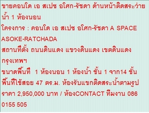 ขายคอนโด A SPACE ASOKE-RATCHADA 47 sq.m. 1 นอน 2.95 MB ติดสระว่ายน้ำ ขายถูก