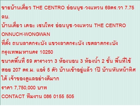 ไม่รับนายหน้า ขายบ้านเดี่ยว THE CENTRO ONNUCH-WONGWAN 69 ตารางวา ราคา 7.75 MB. 2 ชั้น สวย ขายบ้านเดี่ยว THE CENTRO ONNUCH-WONGWAN 69 ตารางวา รายละเอียดห้องและบ้าน ขายบ้านเดี่ยว THE CENTRO อ่อนนุช-วงแหวน 69ตร.วา 7.75ลบ.