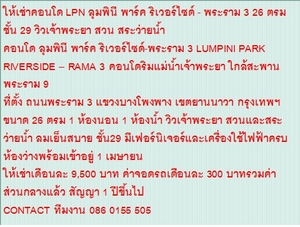 ไม่รับนายหน้า ให้เช่าคอนโด LPN ลุมพินี พาร์ค ริเวอร์ไซด์ - พระราม 3 26 ตรม ชั้น 29 วิวเจ้าพระยา สวน สระว่ายน้ำ