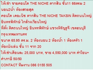 ไม่รับนายหน้า ให้เช่า ขายคอนโด THE NICHE ตากสิน ชั้น11 66ตรม 2นอน2น้ำ ห้องสวยสุด