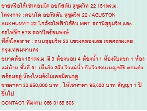 ไม่รับนายหน้าทุกรณี ขายหรือให้เช่าคอนโด ออกัสตัน สุขุมวิท 22 151ตร.ม. ชั้นสูงวิวสวย