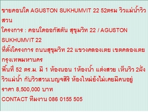 ไม่รับนายหน้าทุกรณี ขายคอนโด AGUSTON SUKHUMVIT 22 52ตรม วิวแม่น้ำวิวสวน