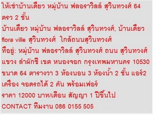 ให้เช่าบ้านเดี่ยว หมุ่บ้าน ฟลอราวิลล์ สุวินทวงศ์ 64ตรว 2 ชั้น