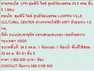 ไม่รับนายหน้าทุกรณี ขายคอนโด LPN ลุมพินี วิลล์ ศูนย์วัฒนธรรม 34.5 ตรม ชั้น 5 1.8ลบ.