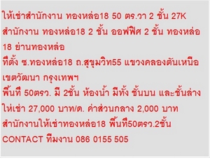 ไม่รับนายหน้า ให้เช่าสำนักงาน ทองหล่อ18 50 ตร.วา 2 ชั้น 27K / ให้เช่าสำนักงาน ทองหล่อ18 50 ตร.วา 2 ชั้น 27K รายละเอียด ให้เช่าสำนักงาน ทองหล่อ18 50 ตร.วา 2 ชั้น 27K