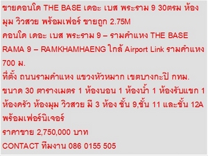 ไม่รับนายหน้า ขายคอนโด THE BASE เดอะ เบส พระราม 9 30ตรม ห้องมุม วิวสวย พร้อมเฟอร์ ขายถูก 2.75M