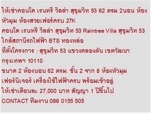 ให้เช่า คอนโดมิเนี่ยม Raintree villa ซ.สุขุมวิท 53 ขนาด 2 ห้องนอน 62 ตรม. ชั้น 2 ห้องหัวมุม เฟอร์นิเจอร์ เครื่องใช้ไฟฟ้าครบ พร้อมเข้าอยู่ เดือนละ 27000 บาท (ประกัน 2เดือน+ล่วงหน้า 1 เดือน) ทำสัญญา 1 ปี ตึกสูง 8 ชั้น 150 ห้อง มีสวน สระว่ายน้ำ