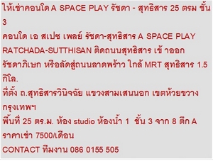 ให้เช่าคอนโด A SPACE PLAY รัชดา - สุทธิสาร 25 ตรม ชั้น3