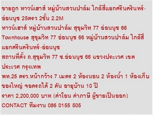 ขายถูก ทาวน์เฮาส์ หมู่บ้านสวนปาล์ม ใกล้สี่แยกศรีนครินทร์-อ่อนนุช 25ตรว 2ชั้น 2.2M