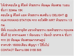 ไม่รับนายหน้า ให้เช่าคอนโด ยู ดีไลท์ ห้วยขวาง ห้องมุม ห้องสวย 1นอน ชั้น11 32ตรม 15K