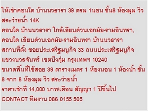 ไม่รับนายหน้า ให้เช่าคอนโด บ้านนวธารา 39 ตรม 1นอน ชั้น8 ห้องมุม วิว สระว่ายน้ำ 14K