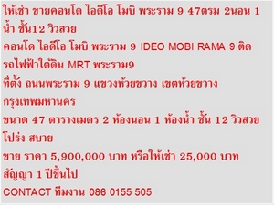 ไม่รับนายหน้า ให้เช่า ขายคอนโด ไอดีโอ โมบิ พระราม 9 47ตรม 2นอน 1น้ำ ชั้น12 วิวสวย