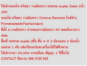 ให้เช่าคอนโด คริสมา รามอินทรา 60ตรม duplex 2นอน 2น้ำ 25K