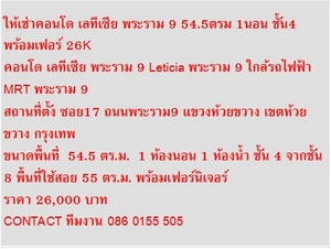 ไม่รับนายหน้า ให้เช่าคอนโด เลทีเซีย พระราม 9 54.5ตรม 1นอน ชั้น4 พร้อมเฟอร์ 26K