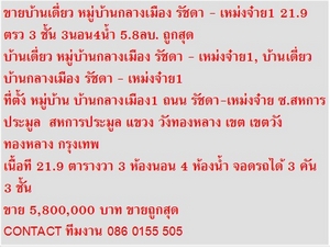 ไม่รับนายหน้า ขายบ้านเดี่ยว หมู่บ้านกลางเมือง รัชดา - เหม่งจ๋าย1 21.9ตรว 3 ชั้น 3นอน4น้ำ 5.8ลบ. ถูกสุด ขายบ้านเดี่ยว หมู่บ้านกลางเมือง รัชดา - เหม่งจ๋าย1 รายละเอียดห้องและบ้าน ขายบ้านเดี่ยว หมู่บ้านกลางเมือง รัชดา - เหม่งจ๋าย1 21.9ตรว 3 ชั้น 3นอน4น้ำ 5.8ลบ. ถูกสุด