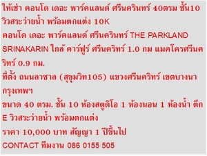 ไม่รับนายหน้า ให้เช่าคอนโด เดอะ พาร์คแลนด์ ศรีนครินทร์ 40ตรม ชั้น10 วิวสระว่ายน้ำ พร้อมตกแต่ง 10K