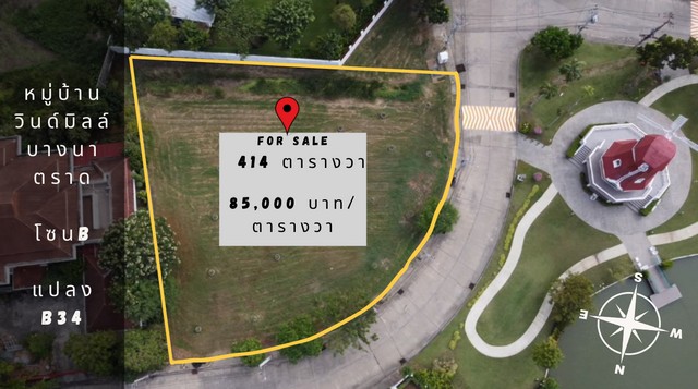 ขายที่ดิน หมู่บ้านวินด์มิลล์ พาร์ค บางนาตราด กม.10 (Windmill Park) ขนาด 414 ตารางวา แปลงมุมหน้าสวนริมน้ำ ใกล้Megaบางนา