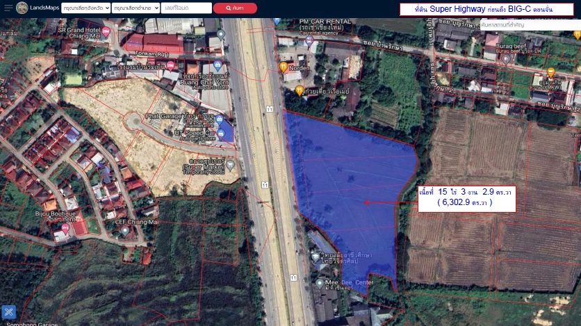ขายที่ดินติดถนนซุปเปอร์ไฮเวย์ ทำเลทอง 5 นาที ใกล้บิ๊กซี แมคโคร เซ็นทรัล รพ.กรุงเทพ เนื้อที่ 15 ไร่ 3 งาน 2.9 ตารางวา จ.เชียงใหม่