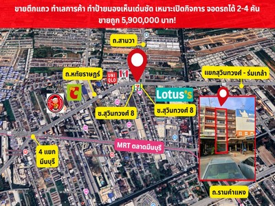 โอกาสเป็นของคนเห็นก่อน ขายอาคารพาณิชย์ติดถนนสุวินทวงศ์ ติดถนนใหญ่ ใกล้ 4 แยกมีนบุรี เหมาะเปิดกิจการ