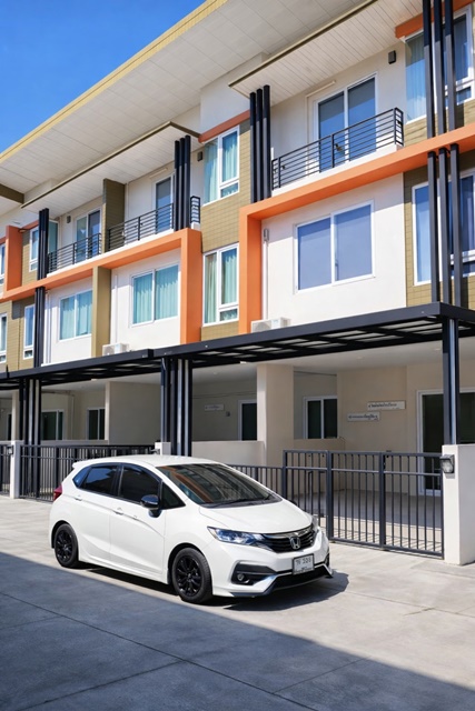 จอดรถได้ 2 คัน ในบ้าน 1 คัน และหน้าบ้าน 1 คัน พร้อมที่จอดส่วนกลางจำนวนมาก